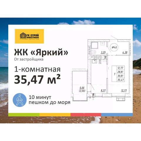 КВАРТИРА У МОРЯ В ЗЕЛЕНОГРАДСКЕ 10 минут пешком до пляжа! Семейная ипотека 5% Рассрочка от застройщика 0% Подарок: умный дом от Сбера Продается квартира комфорт-класса в новом малоэтажном ЖК "Яркий" у Балтийского моря, г. Зеленоградск. Прямая продажа от застройщика. Тихая локация в развивающемся районе - вдали от городского шума и рядом с побережьем. 1-комн. квартира 4 этаж О ЖИЛОМ КОМПЛЕКСЕ 4-этажные дома с лифтами Удобные планировки Отделка "серый ключ" - коммуникации спрятаны, стены оштукатурены, полы залиты Металлические двери с тепло- и шумоизоляцией Автономное газовое отопление Детские площадки, зоны отдыха, озеленение Доступная среда Парковочные места для жителей и гостей комплекса Закрытая территория со шлагбаумами ЛОКАЦИЯ ЖК расположен в посёлке Малиновка - это: тишина чистый, комфортный пляж 10 минут до Куршской косы на автомобиле 8 минут до центра Зеленоградска 35 минут до Калининграда магазины, кафе, транспорт - рядом О ЗАСТРОЙЩИКЕ "СТРОЙИНВЕСТИЦИЯ" Строим с 2014 года в Калининграде и области. Сопровождаем клиента на всех этапах - от подбора квартиры до регистрации сделки. Работаем только с эскроу-счетами - ваши средства защищены! Возможна дистанционная покупка и онлайн-сделка. ЖК "Яркий" - комфортная жизнь у моря и выгодная инвестиция. Подходит для проживания, отдыха и сдачи в аренду. Позвоните или напишите нам - расскажем о планировках, ипотеке и актуальных предложениях, запишем на просмотр или онлайн-показ. Продам 1-комнатную квартиру 30 м2 (квадратных метров) в Зеленоградске.
