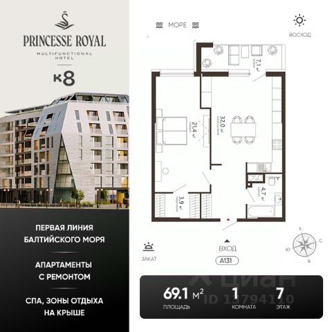 Прямая продажа от застройщика! Готовность проекта - 100%. Ключи сразу после сделки! Впечатляющая квартира с предчистовой отделкой, потолками 3 м и панорамным WOW-видом на парк. ЭКО квартал "РусскаЯ ЕвропА" — это современное пространство для жизни, состоящее из монолитно-кирпичных зданий переменной этажности. Застройщиком представлены разнообразные планировки квартир: от уютных студий до просторных четырехкомнатных квартир, включая двухуровневые решения и европланировки. Квартиры сдаются в предчистовой и чистовой отделке Особенности ЖК "Адрес Счастья" ЭКОквартала "Русская Европа": Проект комфорт-класса в престижном Ленинградском районе города; Ультрасовременные экологические инженерные решения в каждом доме и каждой квартире; Элегантное решение композиции фасадов от архитектурного бюро с мировым именем и две победы на международных архитектурных премиях URBAN AWARDS; Впервые в Калининграде lounge-зоны на крышах домов; Европейский подход к благоустройству: площадь с фонтанами, ландшафтный парк, детские и спортивные площадки; Панорамное остекление квартир поражают своими головокружительными видами на архитектуру комплекса и зеленые виды парков; Продуманная концепция инфраструктуры: Школа, детский сад и поликлиника на территории комплекса, уютные кафе и рестораны, супермаркет, фитнес-студия, службы сервиса, детский центр развития. Транспортная доступность: Удобный выезд на Московский проспект, улицу Гагарина и Большую Окружную; В пешей доступности Суздальский парк и городской парк ДЕВАУ Квартира с предчистовой отделкой Качественная предчистовая отделка позволит проявить творческий подход к созданию уникального дизайна квартиры, а все черновые работы, включая установку внутренних перегородок, разводку электричества и мокрых точек уже будут выполнены. Каждая квартира отличается особыми преимуществами и подготовлена к системе умный дом: - Панорамные окна от потолка до пола; - Собственная терраса; - Мастер спальня; - Гардеробная; - Дополнительная, сверхнормативная шумо/гидроизоляция стен и перекрытий - Индивидуальная приточно-вытяжная вентиляция с фильтрацией и рекуперацией Официальный отдел продаж проекта "Русская Европа" предлагает своим клиентам специальные условия приобретения квартир в рамках программ ипотечного кредитования от банков-партнеров. Больше подробностей о квартирах жилого комплекса "Адрес Счастья" и уникальное предложение для вашего бюджета - по телефону отдела продаж! Звоните! Купить 1-комнатную квартиру площадью примерно 70 м2 (кв.м.) в Калининградской области.