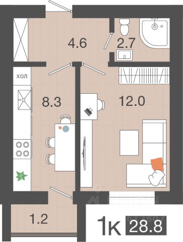 Общая площадь квартиры составляет 41 кв. м, жилая площадь — 13.2 кв. м, а просторная кухня — 15.6 кв. м.