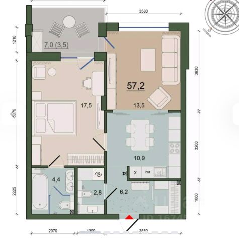 Общая площадь квартиры составляет 41 кв. м, жилая площадь — 13.2 кв. м, а просторная кухня — 15.6 кв. м.