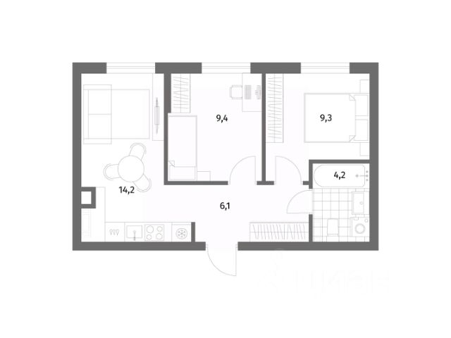 Общая площадь квартиры: 46.5 кв.м, площадь комнат (11.8/16.2), площадь кухни 7 кв.м.