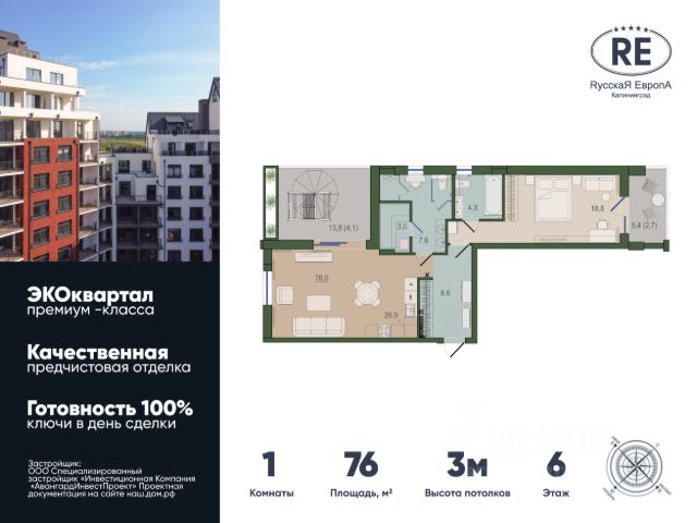 Прямая продажа от застройщика! Готовность проекта - 100%. Ключи сразу после сделки! Впечатляющая квартира с предчистовой отделкой, потолками 3 м и панорамным WOW-видом на парк. ЭКО квартал "РусскаЯ ЕвропА" — это современное пространство для жизни, состоящее из монолитно-кирпичных зданий переменной этажности. Застройщиком представлены разнообразные планировки квартир: от уютных студий до просторных четырехкомнатных квартир, включая двухуровневые решения и европланировки. Квартиры сдаются в предчистовой и чистовой отделке Особенности ЖК "Адрес Счастья" ЭКОквартала "Русская Европа": Проект комфорт-класса в престижном Ленинградском районе города; Ультрасовременные экологические инженерные решения в каждом доме и каждой квартире; Элегантное решение композиции фасадов от архитектурного бюро с мировым именем и две победы на международных архитектурных премиях URBAN AWARDS; Впервые в Калининграде lounge-зоны на крышах домов; Европейский подход к благоустройству: площадь с фонтанами, ландшафтный парк, детские и спортивные площадки; Панорамное остекление квартир поражают своими головокружительными видами на архитектуру комплекса и зеленые виды парков; Продуманная концепция инфраструктуры: Школа, детский сад и поликлиника на территории комплекса, уютные кафе и рестораны, супермаркет, фитнес-студия, службы сервиса, детский центр развития. Транспортная доступность: Удобный выезд на Московский проспект, улицу Гагарина и Большую Окружную; В пешей доступности Суздальский парк и городской парк ДЕВАУ Квартира с предчистовой отделкой Качественная предчистовая отделка позволит проявить творческий подход к созданию уникального дизайна квартиры, а все черновые работы, включая установку внутренних перегородок, разводку электричества и мокрых точек уже будут выполнены. Каждая квартира отличается особыми преимуществами и подготовлена к системе умный дом: - Панорамные окна от потолка до пола; - Собственная терраса; - Мастер спальня; - Гардеробная; - Баня в квартире (!) - Дополнительная, сверхнормативная шумо/гидроизоляция стен и перекрытий - Индивидуальная приточно-вытяжная вентиляция с фильтрацией и рекуперацией Официальный отдел продаж проекта "Русская Европа" предлагает своим клиентам специальные условия приобретения квартир в рамках программ ипотечного кредитования от банков-партнеров. Больше подробностей о квартирах жилого комплекса "Адрес Счастья" и уникальное предложение для вашего бюджета - по телефону отдела продаж! Звоните! 1-комнатная квартира с двумя санузлами в Калининграде.