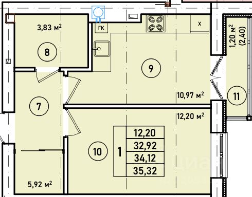 Продается квартира площадью 32 м² на 1 этаже 2 секции в River Park от компании ГК "ТРЕСТ". Площадь кухни 10.8 м².
