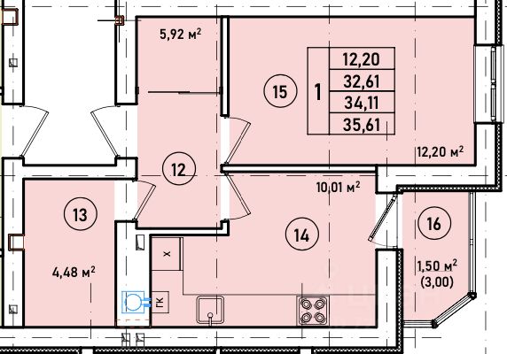 Продается квартира площадью 33.8 м² на 1 этаже 1 секции в River Park от компании ГК "ТРЕСТ". Площадь кухни 14.1 м².
