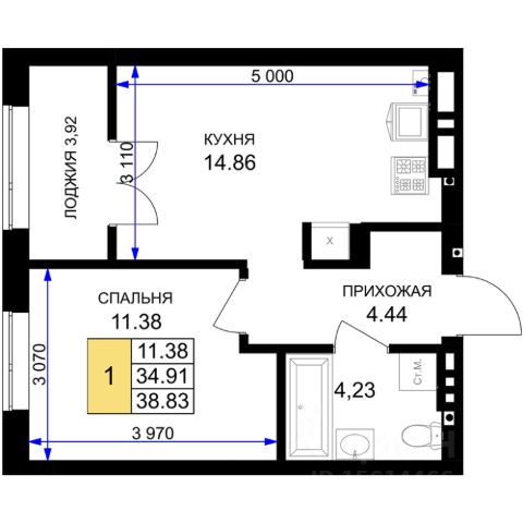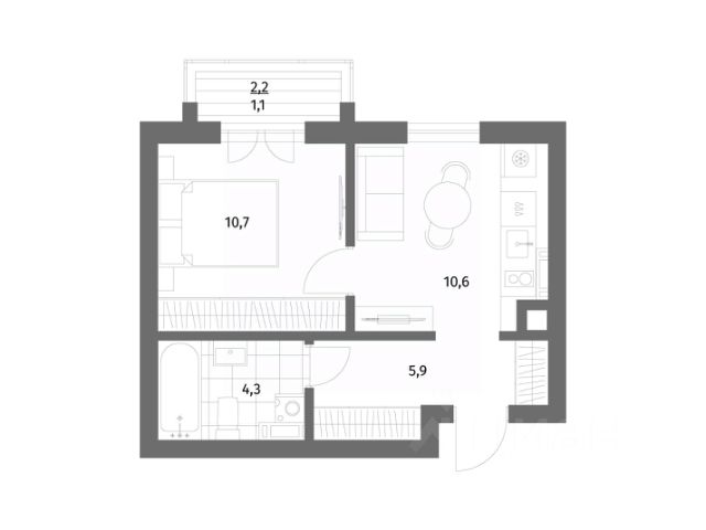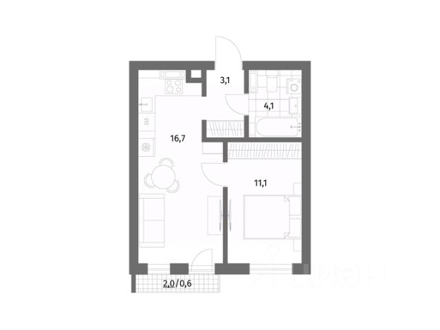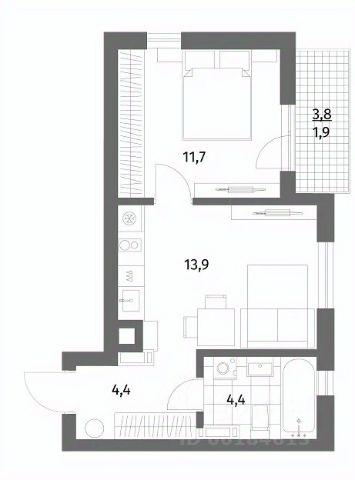 + Общая площадь: 34,4м²;