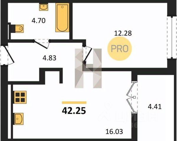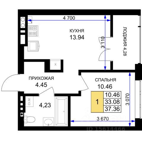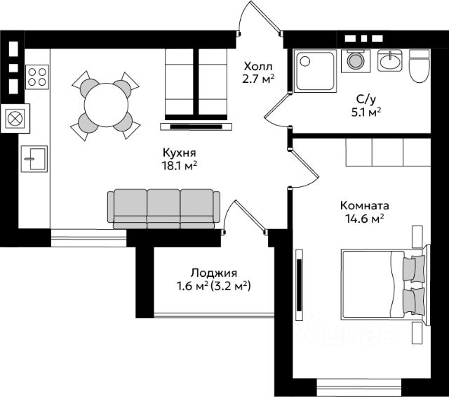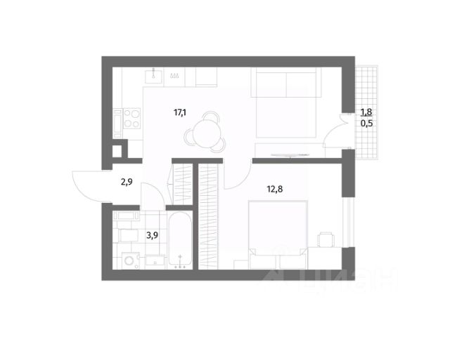 Удобная планировка с жилой зоной и функциональной кухней.• много естественного света, нет шума с улицы;