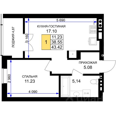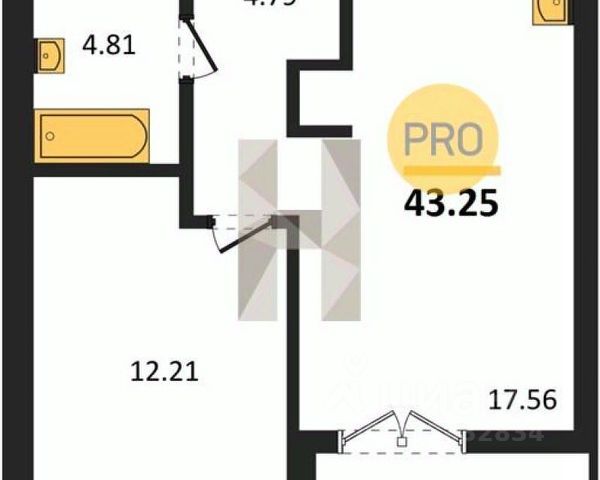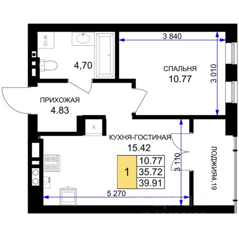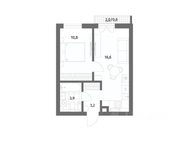+ Общая площадь: 34,4м²;