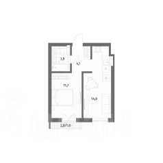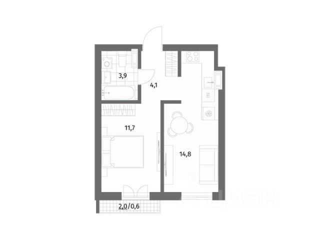Удобная планировка с жилой зоной и функциональной кухней.• много естественного света, нет шума с улицы;