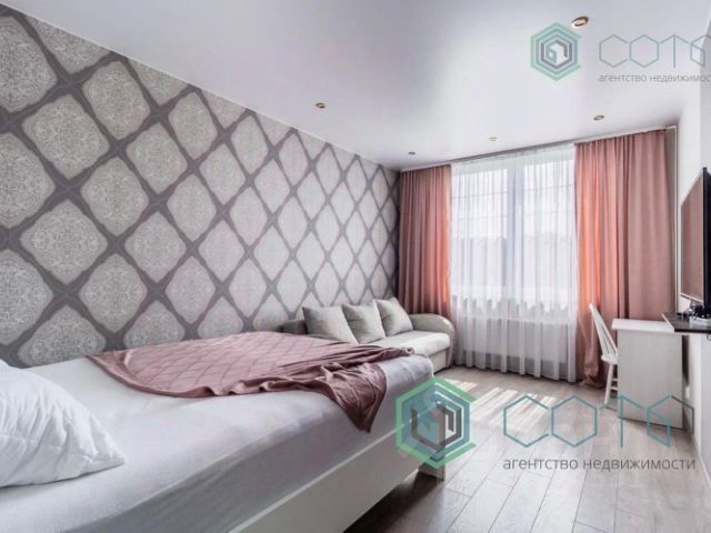 Спальная зона деликатно отделена от гостевой и обладает балконом. Окна квартиры выходят на юго-восточную сторону света.