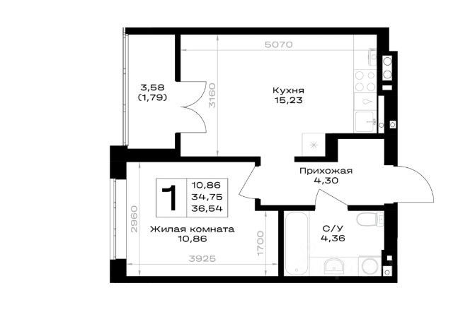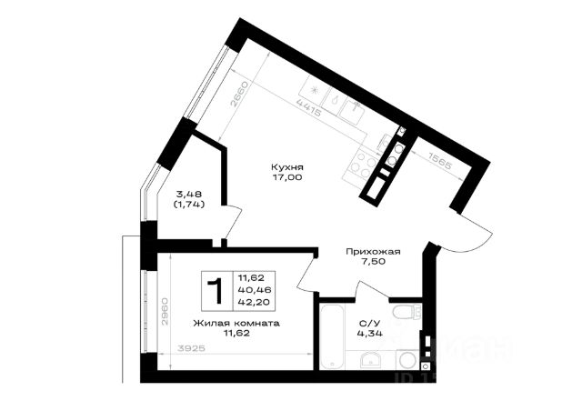 Квартира располагается на 3-м этаже 5-ти этажного монолитного дома, общая площадь 42 м2.
