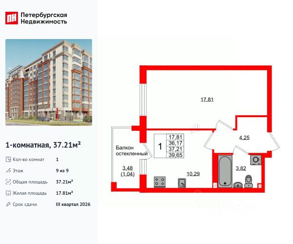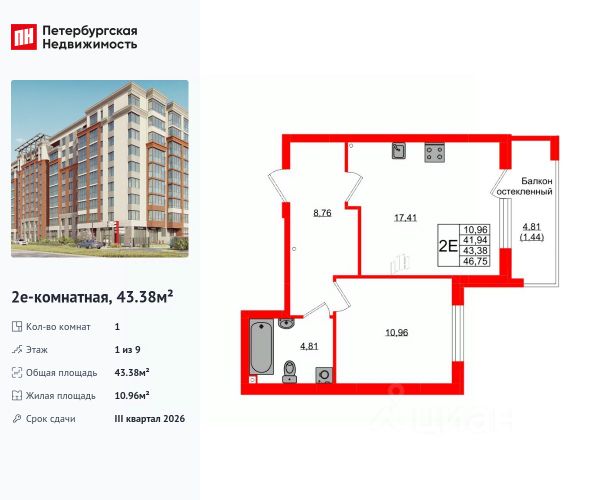 Площадь квартиры 48 м2. с учетом лоджии, просторная кухня-гостиная 17,8 м2, с выходом на закрытую лоджию 4,5 м2. Жилая комната 13,8 м2, с/узел совмещен 4,4 м2, прихожая с гардеробной 9 м2 .