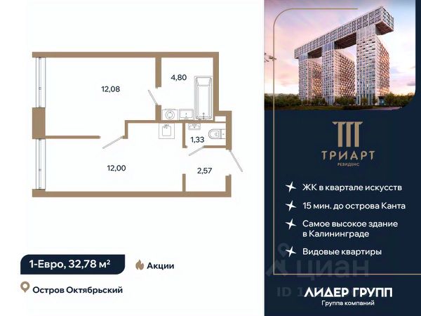 "ТРИАРТ Резиденс" — невероятный и впечатляющий премьерный проект ГК "Лидер Групп" в Калининграде. Домартобъект расположен на острове Октябрьский, в центре нового культурного кластера федерального значения и в 15 минутах ходьбы от кафедрального собора. Территория обладает отличной транспортной доступностью, здесь создается принципиально новая городская среда, превращающая локацию в ультрасовременный центр общественноделовой жизни региона.