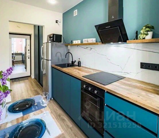 - кухня оборудована встроенной мебелью с подсветкой, варочной панелью, духовым шкафом, вытяжкой и холодильником.