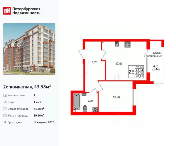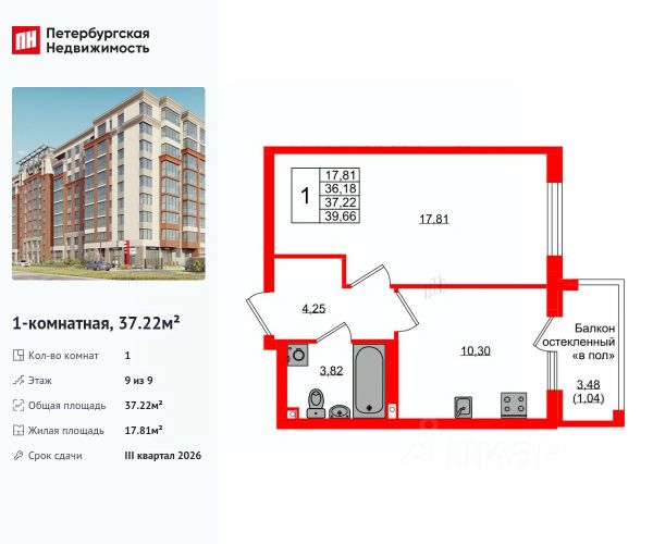 Общая площадь квартиры 33.1 м2, площадь кухни 10м2, жилая площадь 19.6м2. Санузел совмещен.