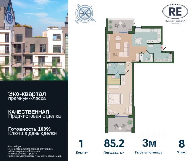 Прямая продажа от застройщика! Готовность проекта - 100%. Ключи сразу после сделки! Впечатляющая квартира с предчистовой отделкой, потолками 3 м и панорамным WOW-видом на парк. ЭКО квартал "РусскаЯ ЕвропА" — это современное пространство для жизни, состоящее из монолитно-кирпичных зданий переменной этажности. Застройщиком представлены разнообразные планировки квартир: от уютных студий до просторных четырехкомнатных квартир, включая двухуровневые решения и европланировки. Квартиры сдаются в предчистовой и чистовой отделке Особенности ЖК "Адрес Счастья" ЭКОквартала "Русская Европа": Проект комфорт-класса в престижном Ленинградском районе города; Ультрасовременные экологические инженерные решения в каждом доме и каждой квартире; Элегантное решение композиции фасадов от архитектурного бюро с мировым именем и две победы на международных архитектурных премиях URBAN AWARDS; Впервые в Калининграде lounge-зоны на крышах домов; Европейский подход к благоустройству: площадь с фонтанами, ландшафтный парк, детские и спортивные площадки; Панорамное остекление квартир поражают своими головокружительными видами на архитектуру комплекса и зеленые виды парков; Продуманная концепция инфраструктуры: Школа, детский сад и поликлиника на территории комплекса, уютные кафе и рестораны, супермаркет, фитнес-студия, службы сервиса, детский центр развития. Транспортная доступность: Удобный выезд на Московский проспект, улицу Гагарина и Большую Окружную; В пешей доступности Суздальский парк и городской парк ДЕВАУ Квартира с предчистовой отделкой Качественная предчистовая отделка позволит проявить творческий подход к созданию уникального дизайна квартиры, а все черновые работы, включая установку внутренних перегородок, разводку электричества и мокрых точек уже будут выполнены. Каждая квартира отличается особыми преимуществами и подготовлена к системе умный дом: - Панорамные окна от потолка до пола; - Собственная терраса; - Мастер спальня; - Гардеробная; - Баня в квартире (!) - Дополнительная, сверхнормативная шумо/гидроизоляция стен и перекрытий - Индивидуальная приточно-вытяжная вентиляция с фильтрацией и рекуперацией Официальный отдел продаж проекта "Русская Европа" предлагает своим клиентам специальные условия приобретения квартир в рамках программ ипотечного кредитования от банков-партнеров. Больше подробностей о квартирах жилого комплекса "Адрес Счастья" и уникальное предложение для вашего бюджета - по телефону отдела продаж! Звоните!