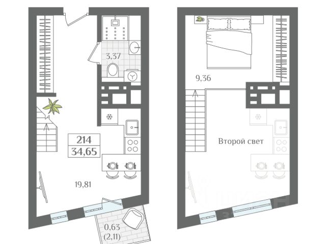 Высокие потолки позволяют создать уникальное пространство для жизни и отдыха, реализовать проект двухуровневой квартиры со вторым светом и полезной площадью 55m2.