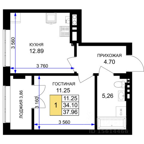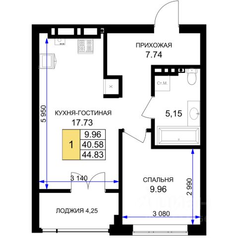 Лоджия 3,6 кв м ,Сан узел совмещен 5,2 кв м.