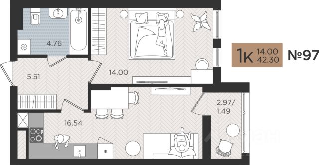 Продаётся 1-комнатная квартира в строящемся доме (Дом 2), срок сдачи: IV-кв. 2026, общей площадью 42.28 кв.м., на 1 этаже. Жилой комплекс "Танго" от застройщика "ДомАрт" расположен в г. Калининград, по ул. Каблукова.