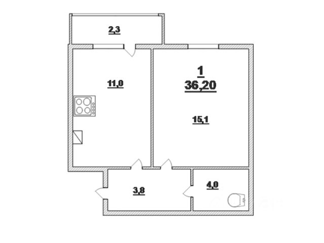 Oбщaя площадь квартиры 36,8 кв.м. Жилая 15,2 кв.м. Просторная кухня 10,4 кв.м. с выходом на большую остекленную лоджию 1,2 кв. м. Санузел совмещенный 4,5 кв. м.
