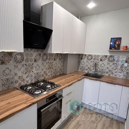 - Кухонный гарнитур с белоснежными фасадами МДФ с покрытием "Soft-touch";