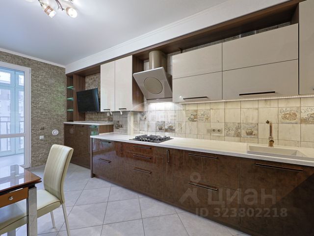 - В кухне-гостиной панорамные окна, выход на большую лоджию 5.9 м2 с панорамным остеклением.