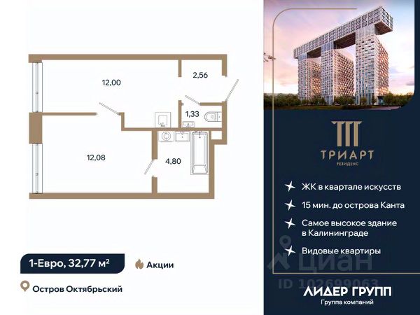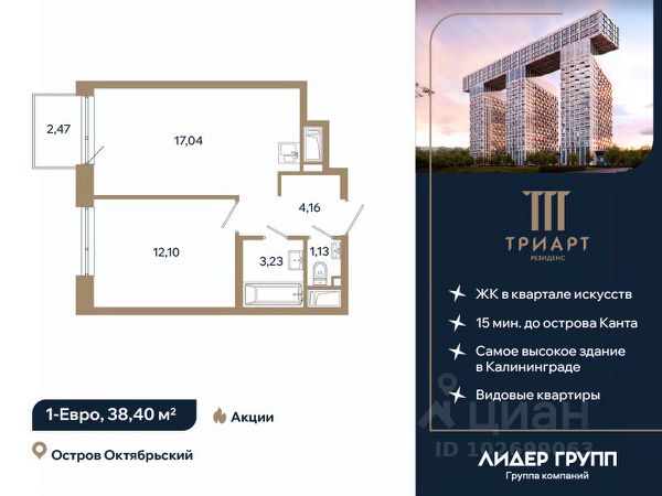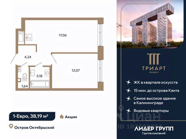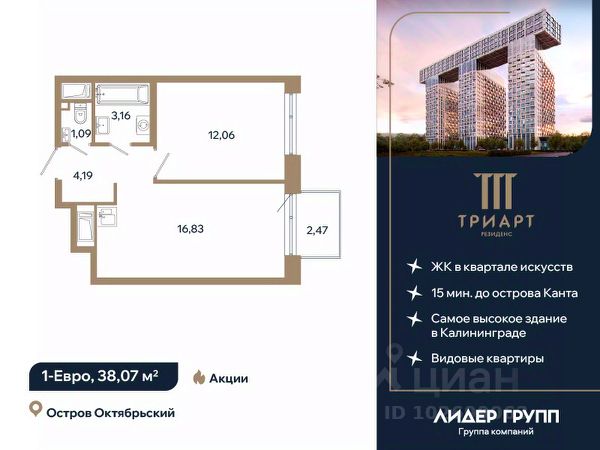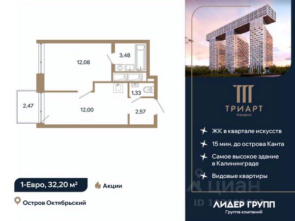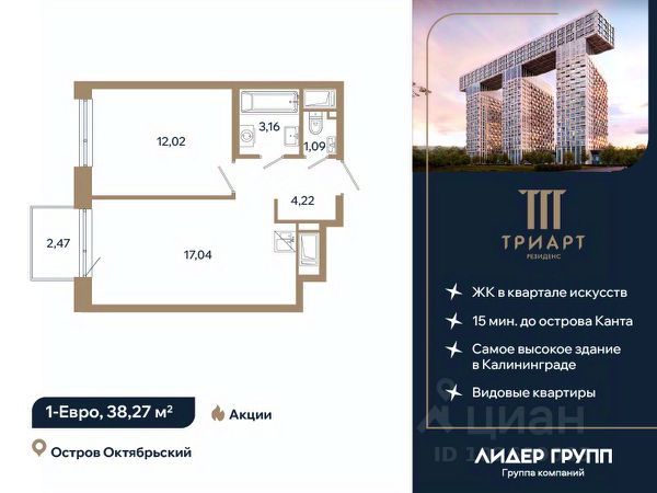 "ТРИАРТ Резиденс" — невероятный и впечатляющий премьерный проект ГК "Лидер Групп" в Калининграде. Домартобъект расположен на острове Октябрьский, в центре нового культурного кластера федерального значения и в 15 минутах ходьбы от кафедрального собора. Территория обладает отличной транспортной доступностью, здесь создается принципиально новая городская среда, превращающая локацию в ультрасовременный центр общественноделовой жизни региона.