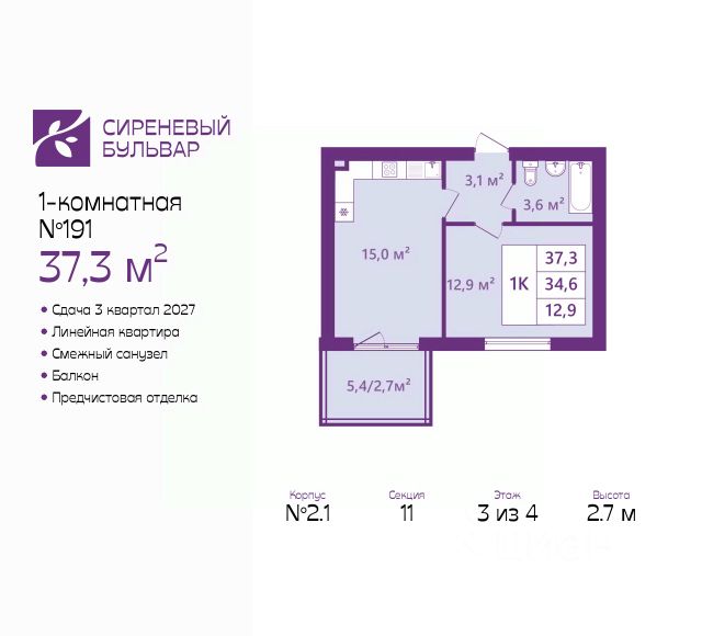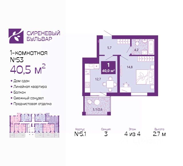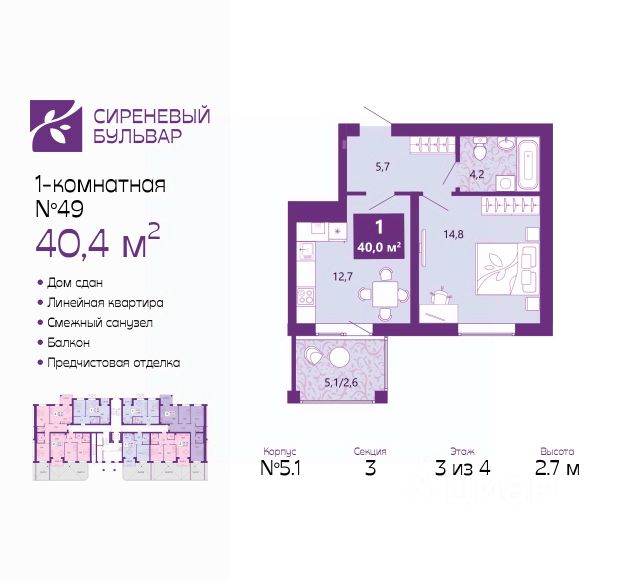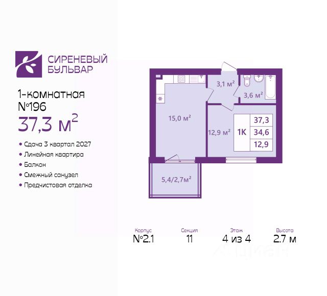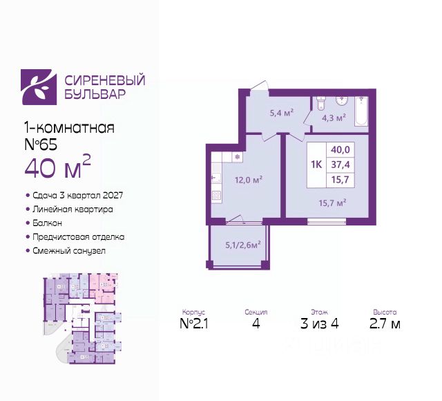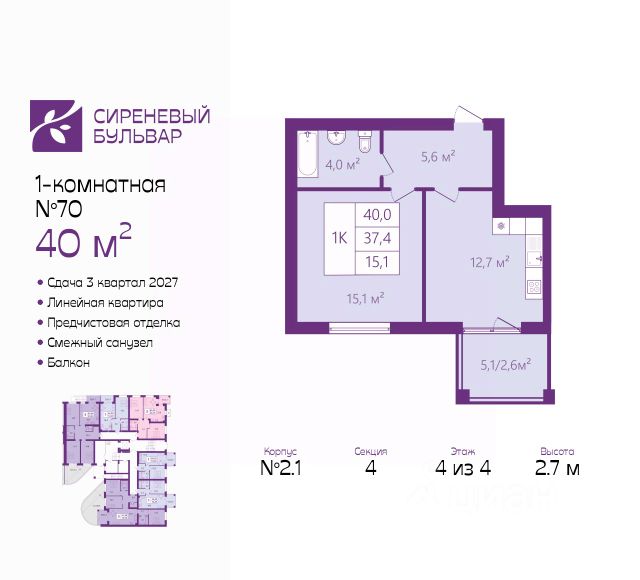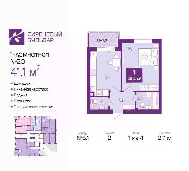 Продается 1-комн. квартира с предчистовой отделкой в ЖК "Сиреневый бульвар" на 4 этаже. Общая площадь: 42.4 кв.м., жилая: 15.6 кв.м., площадь просторной кухни-столовой: 13.4 кв.м. Все окна выходят на одну сторону. В квартире один балкон, один совмещенный и один раздельный санузел. Высота потолков 2.7 м. Дом монолитный, многоподъездный, высотой 4 этажа. Квартира находится в 11-й секции в корпусе 2.1. На этаже 5 квартир. В подъезде 1 грузовой лифт. Окончание строительства - 3 квартал 2027 года. Оформление сделки по договору долевого участия. Жилой комплекс "Сиреневый бульвар" это 5 клубных 4-х этажных домов на 16 квартир и 9 домов с несколькими секциями. Вместе эти дома формируют собственное закрытое пространство с дворовыми территориями, спортивными и детскими площадками, местами отдыха и коммерческими помещениями. Дизайнерские входные группы и небольшие приусадебные участки квартир нижних этажей, обилие зелени, удобные зоны отдыха всё устроено с особым вниманием. Жителей комплекса ждут просторные квартиры комфорт-класса с огромными террасами, мастер-спальнями, гардеробными и кухнями-гостиными. В каждом доме предусмотрены места для хранения велосипедов, кладовые помещения на цокольных этажах. "Сиреневый Бульвар" позволит своим жителям получить все преимущества городского комфорта и максимум плюсов от жизни на природе. Для жителей и гостей предусмотрены парковочные места, вся территория оборудована круглосуточной системой видеонаблюдения. В шаговой доступности находятся детский сад, начальная школа и продовольственные магазины. Жилой Комплекс "Сиреневый Бульвар" - уникальный проект, расположенный в Калининграде - балтийской жемчужине, в городе с богатым прошлым, комфортным настоящим и радужным будущим. Именно Калининград место встречи России и Европы. Жилой Комплекс "Сиреневый Бульвар" находится в географическом центре города. Ленинградский район (бывшие Ротенштейн, Марауненхоф, Лип, Девау, Палве и Куммерау) это северная часть Калининграда, где в довоенные годы располагался Старый город. Жилой комплекс находится рядом с Верхним озером, Нижним прудом и ещё 12 городскими водоемами. Территория всего проекта занимает 21,9 гектаров и находится между улицами Арсенальная, Пехотная и 4-ой Большой окружной. Аккредитация в банках: ПАО "Газпромбанк", "Сбербанк России", ПАО Банк "ВТБ", ПАО Банк "ФК Открытие", ПАО "Промсвязьбанк". #2mFszw