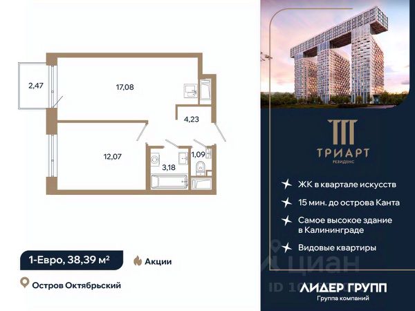 "ТРИАРТ Резиденс" — невероятный и впечатляющий премьерный проект ГК "Лидер Групп" в Калининграде. Домартобъект расположен на острове Октябрьский, в центре нового культурного кластера федерального значения и в 15 минутах ходьбы от кафедрального собора. Территория обладает отличной транспортной доступностью, здесь создается принципиально новая городская среда, превращающая локацию в ультрасовременный центр общественноделовой жизни региона.