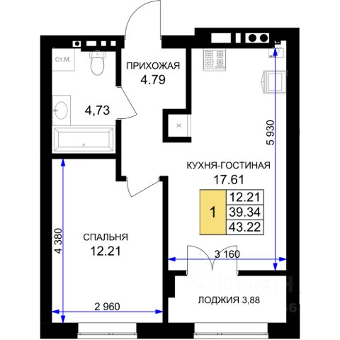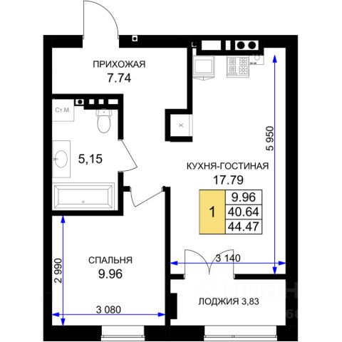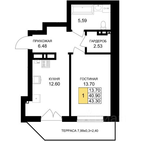Продается 1-комнатная квартира, расположенная на 1-м этаже 7-миэтажного жилого дома на ул.Катериничева, в г.Гурьевске. Общая площадь - 43,91 кв.м., комната-10,73 кв.м., кухня-19,89 кв.м. В квартире имеется большая терраса шириной 2м. Автономное отопление. Срок сдачи дома- 3 кв. 2027 года.