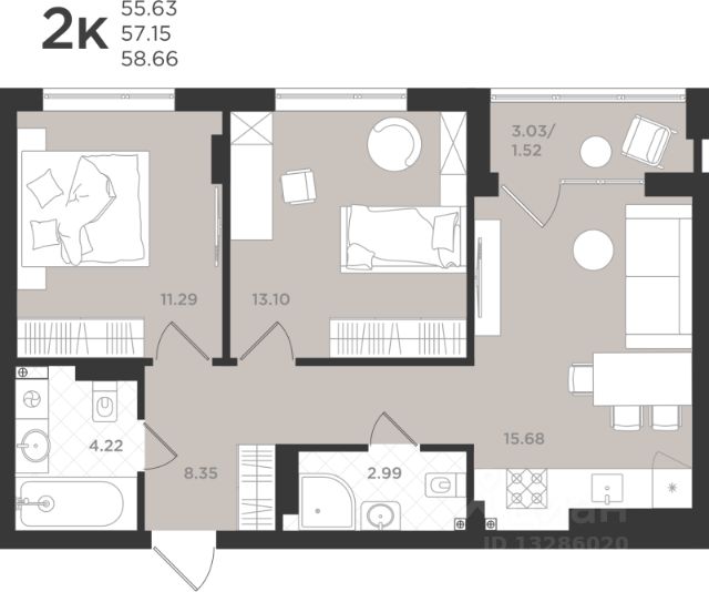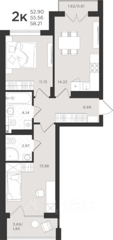 Удачное планировочное решение позволяет организовать комфортное пространство из видовой спальни и просторной кухни-гостиной площадью 20,55 кв.м., выходящей на юго-восточную сторону света.