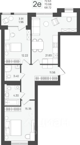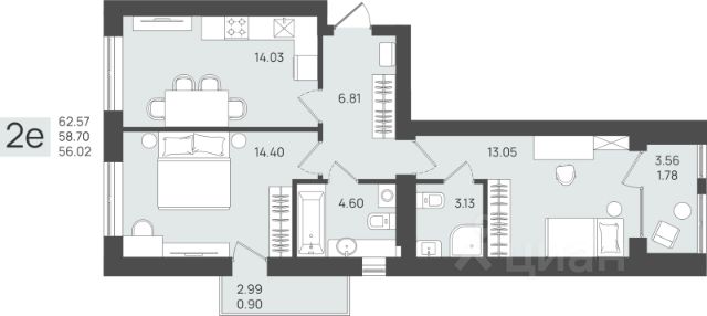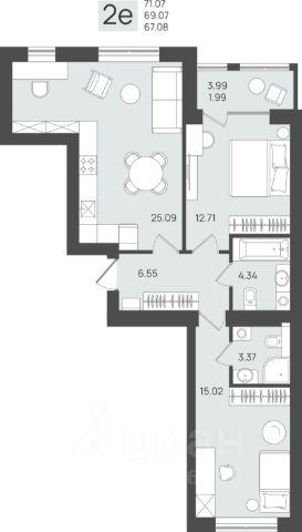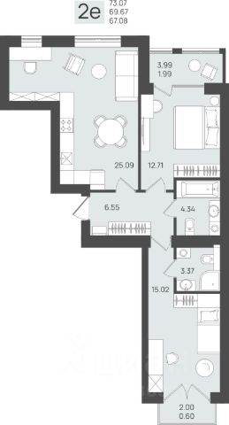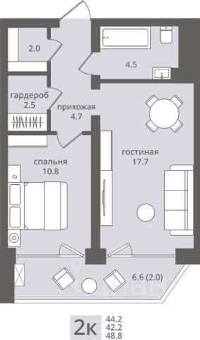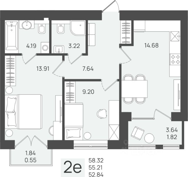 - Кухня-гостиная 19,8 м² — просторно для готовки, ужина и вечернего кино.