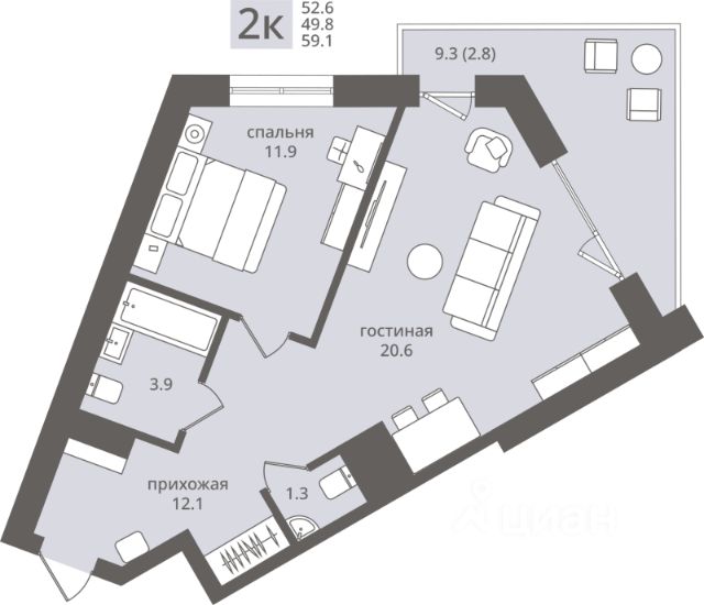 - Прихожая 3,8 м² — вместительная, с местом под большой шкаф-купе.