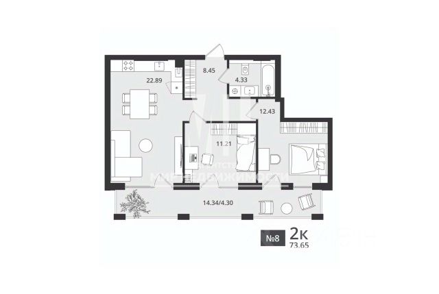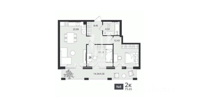 Удачное планировочное решение позволяет организовать комфортное пространство из видовой спальни и просторной кухни-гостиной площадью 22,89 кв.м.