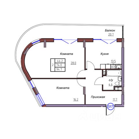 • 2-е спальни площадью 11,31 и 11,20 кв.м.