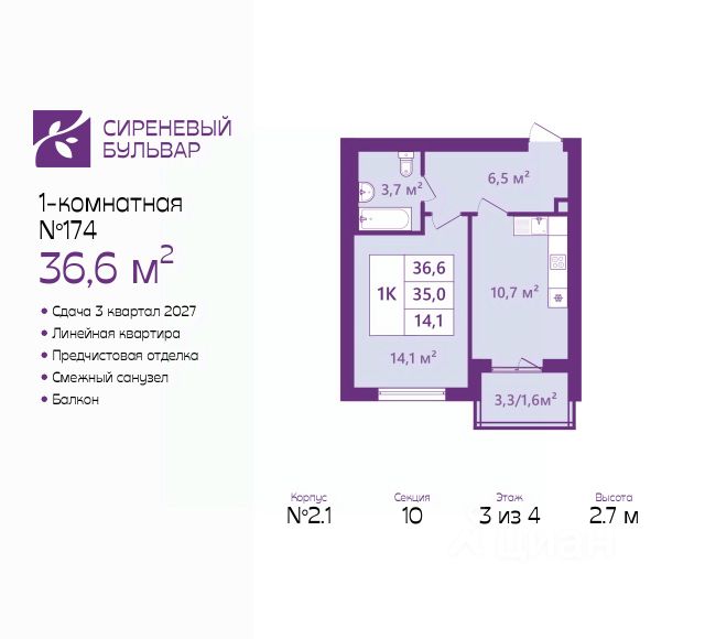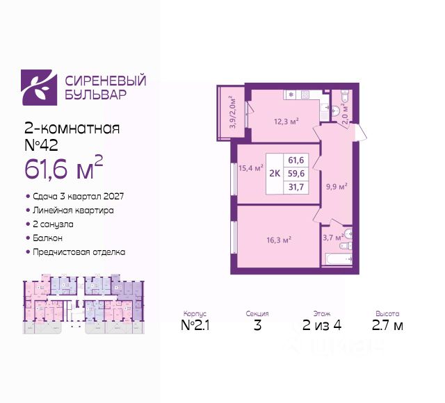 Дом монолитный, многоподъездный, высотой 4 этажа. Квартира находится во 2-й секции в корпусе 2.1. На этаже 4 квартиры. В подъезде 1 грузовой лифт. Окончание строительства - 3 квартал 2027 года. Оформление сделки по договору долевого участия.