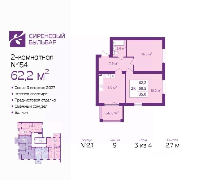 Дом монолитный, многоподъездный, высотой 4 этажа. Квартира находится в 11-й секции в корпусе 2.1. На этаже 5 квартир. В подъезде 1 грузовой лифт. Окончание строительства - 3 квартал 2027 года. Оформление сделки по договору долевого участия.