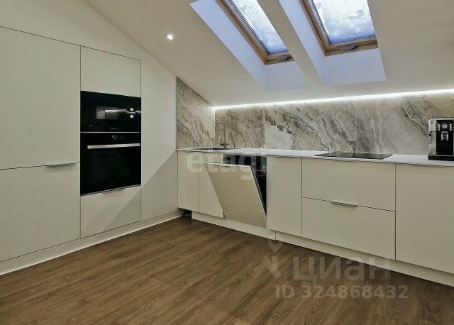 Кухня оборудована всей необходимой бытовой техникой: посудомоечная машина, духовой шкаф, варочная газовая панель, встроенный холодильник, встроенная микроволновая печь и вытяжка.