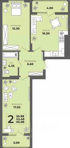 Продаётся 2-комнатная квартира в строящемся доме (Дом 2), срок сдачи: II-кв. 2027, общей площадью 61.73 кв.м., на 6 этаже. ЖК "ГРИНВУД". - Жилой комплекс из двух 8-ми этажных дoмoв - Комфортные и продуманные планировки - Kласc энepгоэффeктивнocти B (выcoкий) - Качественные серый ключ - Автономное газовое отопление. - Лоджии и балконы остеклены (алюминиевые ограждающие конструкции) - Бесшумные грузопассажирские лифты - Качественные и безопасные входные двери - Современное благоустройство двора с детскими и спортивными площадками, местами отдыха взрослых и детей - Ипотека в ВТБ, Банк Санкт-Петербург, Альфа-Банк, Банк Дом РФ ЖК "Гринвуд" находится в экологически чистой части бывшего Балтийского района. Сейчас к этой территории повышенный интерес: здесь нет крупных производств, много зелёных уголков, развитая социальная инфраструктура. Улучшается и транспортная доступность района. В шаговой доступности от ЖК расположена обширная зелёная зоной у озера Пеньковое. Тихое уютное место подарит отдых от городской суеты. При этом рядом находится вся необходимая инфраструктура: детские сады, школы, супермаркеты, рынок, фитнес-центры, салоны красоты, библиотека, торговые центры и остановки общественного транспорта. ЖК "Гринвуд" выполнен в современном архитектурном стиле. На комфортной прилегающей территории предусмотрены места для отдыха взрослых, детские и спортивные площадки, вместительная парковка. В доме также располагаются нежилые помещения различного назначения, так что можно рассчитывать на салоны красоты, аптеки, медицинские центры и магазинчики прямо в ЖК. РЯДОМ: - Озеро "Пеньковое"- Остановка общественного транспорта в 5 минуте ходьбы - Южный рынок - Детский сад 136 - Детская поликлиника 4 - Школа 6 и 56 (2 корпус) - Спортивная школа - Супермаркеты: "Пятерочка", "Вестер" и пр. - Аптеки и медицинские учреждения - АЗС Лукойл 2-комнатная квартира на улице Генерала Толстикова в городе Калининград.