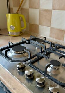 Оснащенная всей необходимой бытовой техникой для комфортного проживания - плитой, духовкой, посудомоечной машиной, микроволновой печью, электрочайником, холодильником. Удобный большой стол и стулья.
