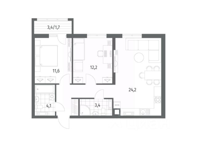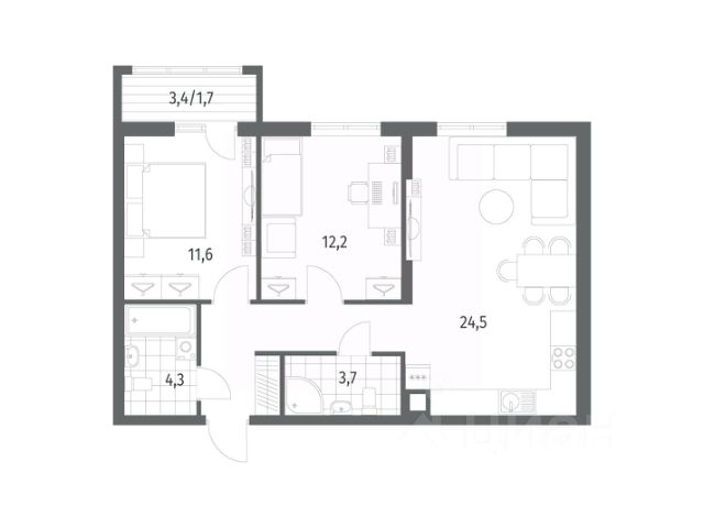 Продается квартира площадью 64.7 м² на 1 этаже 1 секции в River Park от компании ГК "ТРЕСТ". Площадь кухни 24.5 м².