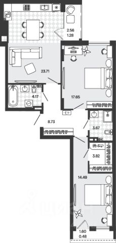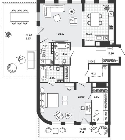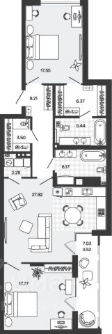 Общая площадь квартиры 67.47 кв. м, продуманная планировка, которая максимально эффективно позволит создать любой интерьер: просторная кухня-гостиная 18.89 кв.м с кабинетом, спальня 12.58 кв.м с выходом на лоджию, спальня 13.86 кв.м с панорамным остеклением, гостевой санузел и ванная комната. Благодаря высоким потолкам и панорамному остеклению все помещения наполняются светом, это создает простор и комфорт для проживания. Автономное отопление. Предчистовая отделка квартиры позволит осуществить любые дизайнерские идеи. Окна квартиры по сторонам света ориентированы на север и юг.