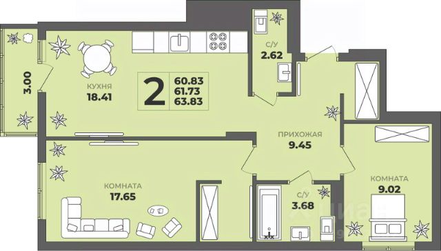 Продаётся 2-комнатная квартира в строящемся доме (Дом 2), срок сдачи: II-кв. 2027, общей площадью 61.73 кв.м., на 6 этаже. ЖК "ГРИНВУД". - Жилой комплекс из двух 8-ми этажных дoмoв - Комфортные и продуманные планировки - Kласc энepгоэффeктивнocти B (выcoкий) - Качественные серый ключ - Автономное газовое отопление. - Лоджии и балконы остеклены (алюминиевые ограждающие конструкции) - Бесшумные грузопассажирские лифты - Качественные и безопасные входные двери - Современное благоустройство двора с детскими и спортивными площадками, местами отдыха взрослых и детей - Ипотека в ВТБ, Банк Санкт-Петербург, Альфа-Банк, Банк Дом РФ ЖК "Гринвуд" находится в экологически чистой части бывшего Балтийского района. Сейчас к этой территории повышенный интерес: здесь нет крупных производств, много зелёных уголков, развитая социальная инфраструктура. Улучшается и транспортная доступность района. В шаговой доступности от ЖК расположена обширная зелёная зоной у озера Пеньковое. Тихое уютное место подарит отдых от городской суеты. При этом рядом находится вся необходимая инфраструктура: детские сады, школы, супермаркеты, рынок, фитнес-центры, салоны красоты, библиотека, торговые центры и остановки общественного транспорта. ЖК "Гринвуд" выполнен в современном архитектурном стиле. На комфортной прилегающей территории предусмотрены места для отдыха взрослых, детские и спортивные площадки, вместительная парковка. В доме также располагаются нежилые помещения различного назначения, так что можно рассчитывать на салоны красоты, аптеки, медицинские центры и магазинчики прямо в ЖК. РЯДОМ: - Озеро "Пеньковое"- Остановка общественного транспорта в 5 минуте ходьбы - Южный рынок - Детский сад 136 - Детская поликлиника 4 - Школа 6 и 56 (2 корпус) - Спортивная школа - Супермаркеты: "Пятерочка", "Вестер" и пр. - Аптеки и медицинские учреждения - АЗС Лукойл