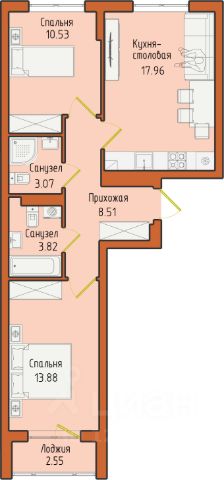 • кухня - 10,5 кв. м.; с выходом на большую лоджию и дополнительным панорамным окном;
