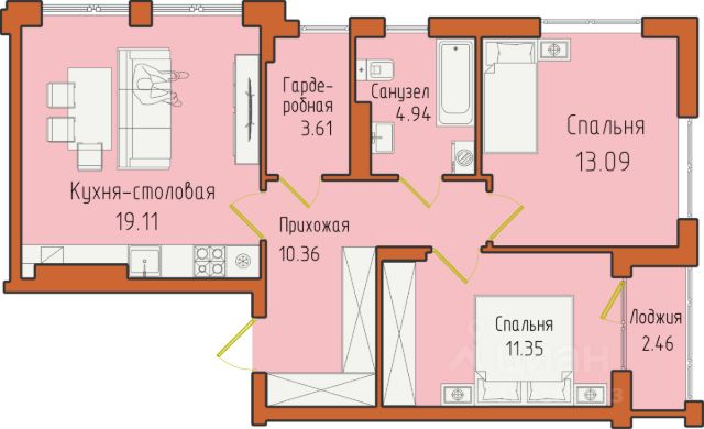 • спальня 13,5 кв. м. с большим панорамным окном,