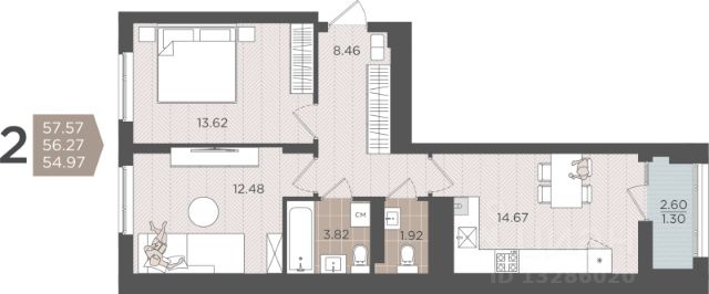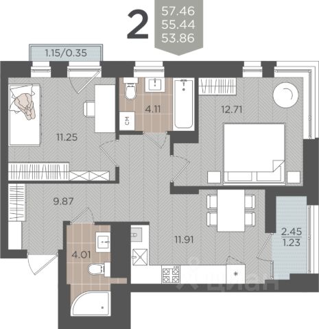 Продаётся 2-комнатная квартира в строящемся доме (Дом 6), срок сдачи: III-кв. 2027, общей площадью 57.41 кв.м., на 9 этаже. Новый жилой комплекс "Этюд" от Группы компаний "Модуль-Стройград" расположен в г. Калининград на ул. Поленова.