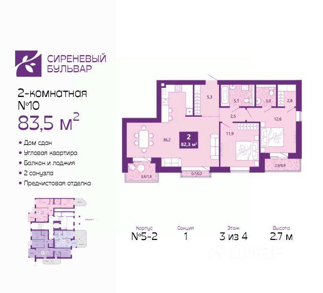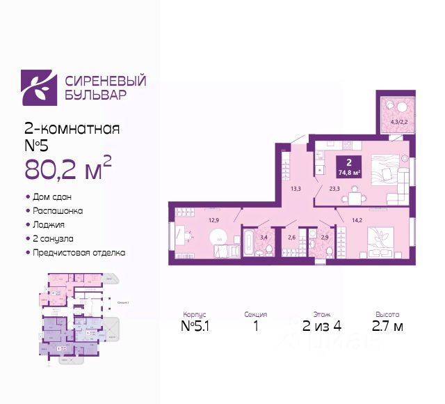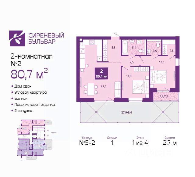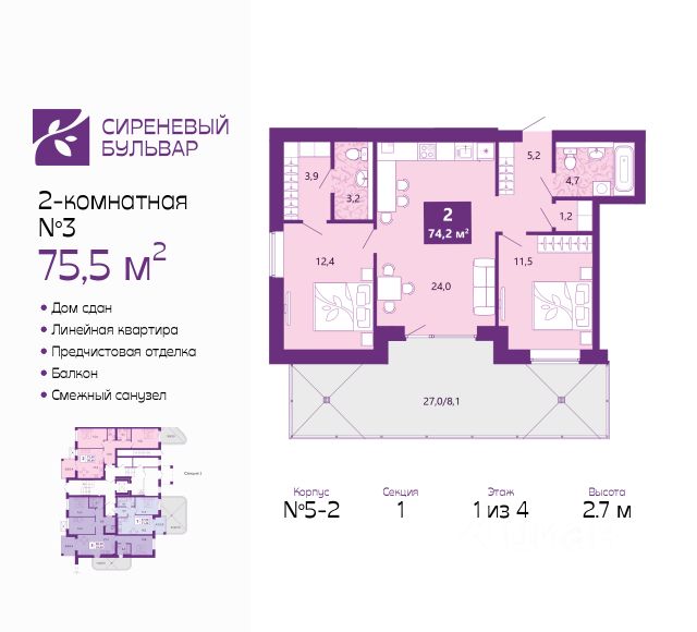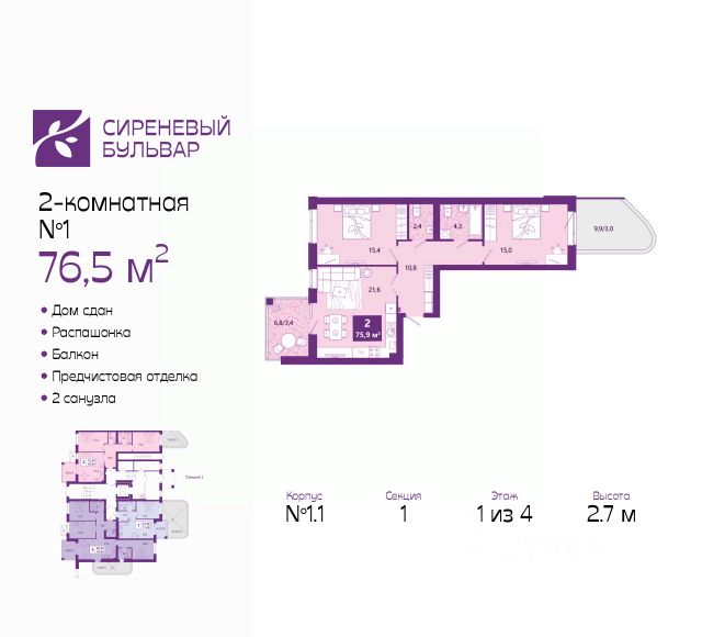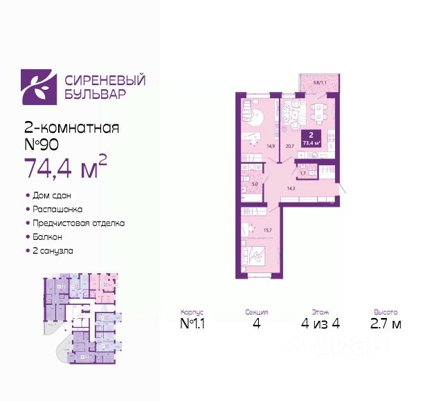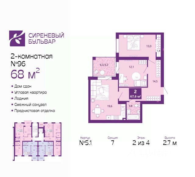 Двухкомнатная квартира с предчистовой отделкой в ЖК "Сиреневый бульвар" на 3 этаже. Общая площадь: 66.4 кв.м., жилая: 29.5 кв.м., площадь просторной кухни-столовой: 15.3 кв.м. Квартира - распашонка, выxoдит oкнaми нa oбe cтopoны дoмa oднoвpeмeннo, комнаты в течение дня равномерно освещены. В квартире один балкон и одна лоджия, один совмещенный и один раздельный санузел. Высота потолков 2.7 м. Дом монолитный, многоподъездный, высотой 4 этажа. Квартира находится в 6-й секции в корпусе 5.1. На этаже 4 квартиры. В подъезде 1 грузовой лифт. В настоящее время строительство окончено, дом сдан в 4 квартале 2025 года. Оформление сделки по договору купли-продажи. Жилой комплекс "Сиреневый бульвар" это 5 клубных 4-х этажных домов на 16 квартир и 9 домов с несколькими секциями. Вместе эти дома формируют собственное закрытое пространство с дворовыми территориями, спортивными и детскими площадками, местами отдыха и коммерческими помещениями. Дизайнерские входные группы и небольшие приусадебные участки квартир нижних этажей, обилие зелени, удобные зоны отдыха всё устроено с особым вниманием. Жителей комплекса ждут просторные квартиры комфорт-класса с огромными террасами, мастер-спальнями, гардеробными и кухнями-гостиными. В каждом доме предусмотрены места для хранения велосипедов, кладовые помещения на цокольных этажах. "Сиреневый Бульвар" позволит своим жителям получить все преимущества городского комфорта и максимум плюсов от жизни на природе. Для жителей и гостей предусмотрены парковочные места, вся территория оборудована круглосуточной системой видеонаблюдения. В шаговой доступности находятся детский сад, начальная школа и продовольственные магазины. Жилой Комплекс "Сиреневый Бульвар" - уникальный проект, расположенный в Калининграде - балтийской жемчужине, в городе с богатым прошлым, комфортным настоящим и радужным будущим. Именно Калининград место встречи России и Европы. Жилой Комплекс "Сиреневый Бульвар" находится в географическом центре города. Ленинградский район (бывшие Ротенштейн, Марауненхоф, Лип, Девау, Палве и Куммерау) это северная часть Калининграда, где в довоенные годы располагался Старый город. Жилой комплекс находится рядом с Верхним озером, Нижним прудом и ещё 12 городскими водоемами. Территория всего проекта занимает 21,9 гектаров и находится между улицами Арсенальная, Пехотная и 4-ой Большой окружной. Аккредитация в банках: "Сбербанк России", ПАО Банк "ВТБ", ПАО "Газпромбанк", ПАО "Промсвязьбанк", ПАО Банк "ФК Открытие". #ZmZ436 Продам 2-комнатную квартиру в ипотеку в новостройке в Калининграде.