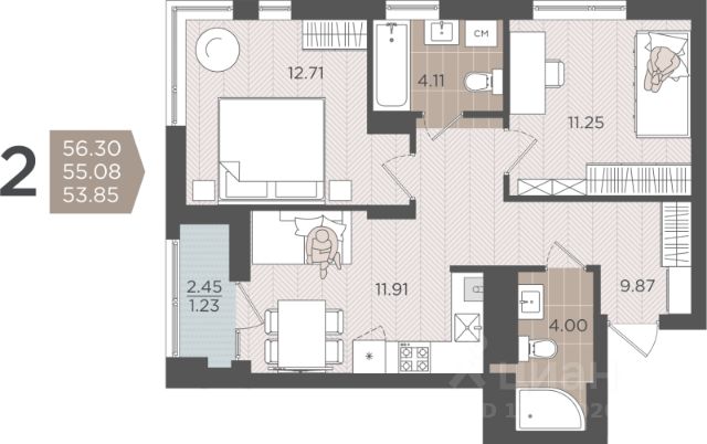 Пpoдaетcя квартира по переуступке на 4 этажe в ЖК "Консул" в Ленинградскoм райoнe г.Калинингpада. Ориентир ул.А.Невского, ул.старшины Дадаева. Эта квартира для тех, кто любит простор и комфорт: для молодой семьи предпринимателей, бизнесменов, менеджеров - находится в жилом комплексе комфорт класса практически в центре города. Чистовая отделка квартиры формата Nord Line (темный оттенок серого). На полу - плитка, натяжные потолки, лоджия застеклена, сантехника установлена, межкомнатные двери. Общая площадь составляет 55,4кв.м (с лоджией), 2 изолированные спальные комнаты и просторная кухня - 11 кв.м. В квартире предусмотрена сауна. Отопление автономное (крышная газовая котельная) с индивидуальным теплосчетчиком , плита - электрическая. Будет высокоскоростной интернет, цифровое телевидение. Безопасное проживание в этом ЖК обеспечивает видео наблюдение, закрытая территория. Удобная транспортная доступность: - 10 мин на автомобиле до делового центра Калининграда - 18 мин до международного аэропорта Храброво - 30 мин до побережья Балтийского моря. Развитая инфраструктура : множество магазинов, в шаговой доступности школы, детские сады, медицинские учреждения, прогулочная зона Верхнего озера. Достойная квартира по хорошей цене.