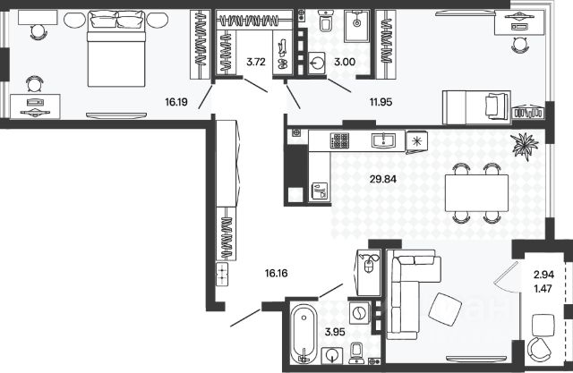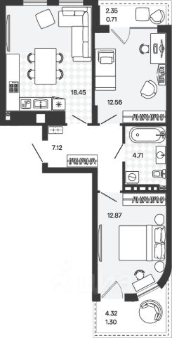 Общая площадь квартиры 67.47 кв. м, продуманная планировка, которая максимально эффективно позволит создать любой интерьер: просторная кухня-гостиная 18.89 кв.м с кабинетом, спальня 12.58 кв.м с выходом на лоджию, спальня 13.86 кв.м с панорамным остеклением, гостевой санузел и ванная комната. Благодаря высоким потолкам и панорамному остеклению все помещения наполняются светом, это создает простор и комфорт для проживания. Автономное отопление. Предчистовая отделка квартиры позволит осуществить любые дизайнерские идеи. Окна квартиры по сторонам света ориентированы на север и юг.