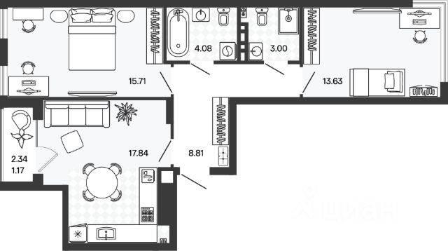 + Общая площадь 80,4 м2, комнаты 22,8 и 16,3 м2. Просторный холл 16 м2, с мебелью и нишами для хранения. Благодаря своим размерам, ХОЛЛ в таких квартирах превращают в общую зону отдыха с мягкой мебелью и телевизором,, в своеобразную третью комнату.