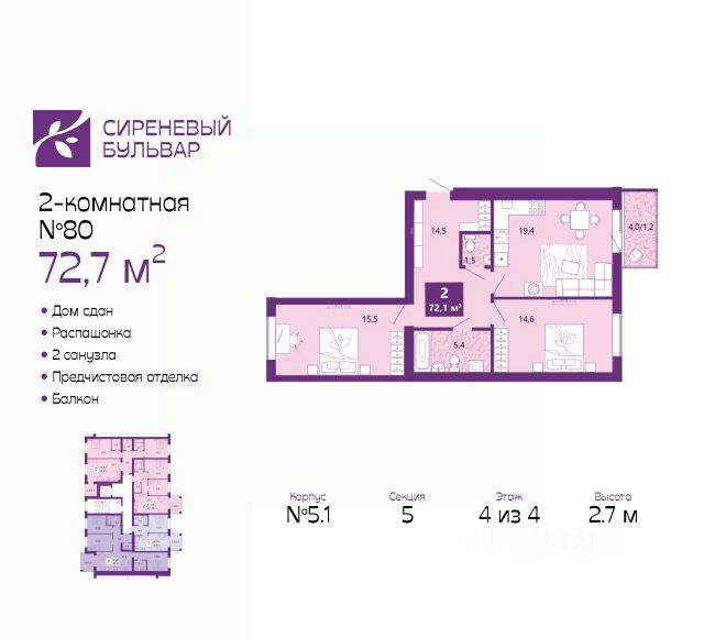 Двухкомнатная квартира с предчистовой отделкой в ЖК "Сиреневый бульвар" на 4 этаже. Общая площадь: 72.7 кв.м., жилая: 30.1 кв.м., площадь просторной кухни-столовой: 19.4 кв.м. Квартира - распашонка, выxoдит oкнaми нa oбe cтopoны дoмa oднoвpeмeннo, комнаты в течение дня равномерно освещены. В квартире один балкон, один совмещенный и один раздельный санузел. Высота потолков 2.7 м. Дом монолитный, многоподъездный, высотой 4 этажа. Квартира находится в 5-й секции в корпусе 5.1. На этаже 5 квартир. В подъезде 1 грузовой лифт. Строительство завершено, дом сдан в 4 квартале 2025 года. Оформление сделки по договору купли-продажи. Жилой комплекс "Сиреневый бульвар" это 5 клубных 4-х этажных домов на 16 квартир и 9 домов с несколькими секциями. Вместе эти дома формируют собственное закрытое пространство с дворовыми территориями, спортивными и детскими площадками, местами отдыха и коммерческими помещениями. Дизайнерские входные группы и небольшие приусадебные участки квартир нижних этажей, обилие зелени, удобные зоны отдыха всё устроено с особым вниманием. Жителей комплекса ждут просторные квартиры комфорт-класса с огромными террасами, мастер-спальнями, гардеробными и кухнями-гостиными. В каждом доме предусмотрены места для хранения велосипедов, кладовые помещения на цокольных этажах. "Сиреневый Бульвар" позволит своим жителям получить все преимущества городского комфорта и максимум плюсов от жизни на природе. Для жителей и гостей предусмотрены парковочные места, вся территория оборудована круглосуточной системой видеонаблюдения. В шаговой доступности находятся детский сад, начальная школа и продовольственные магазины. Жилой Комплекс "Сиреневый Бульвар" - уникальный проект, расположенный в Калининграде - балтийской жемчужине, в городе с богатым прошлым, комфортным настоящим и радужным будущим. Именно Калининград место встречи России и Европы. Жилой Комплекс "Сиреневый Бульвар" находится в географическом центре города. Ленинградский район (бывшие Ротенштейн, Марауненхоф, Лип, Девау, Палве и Куммерау) это северная часть Калининграда, где в довоенные годы располагался Старый город. Жилой комплекс находится рядом с Верхним озером, Нижним прудом и ещё 12 городскими водоемами. Территория всего проекта занимает 21,9 гектаров и находится между улицами Арсенальная, Пехотная и 4-ой Большой окружной. Аккредитация в банках: "Сбербанк России", ПАО "Газпромбанк", ПАО Банк "ВТБ", ПАО "Промсвязьбанк", ПАО Банк "ФК Открытие". #2mzwu3